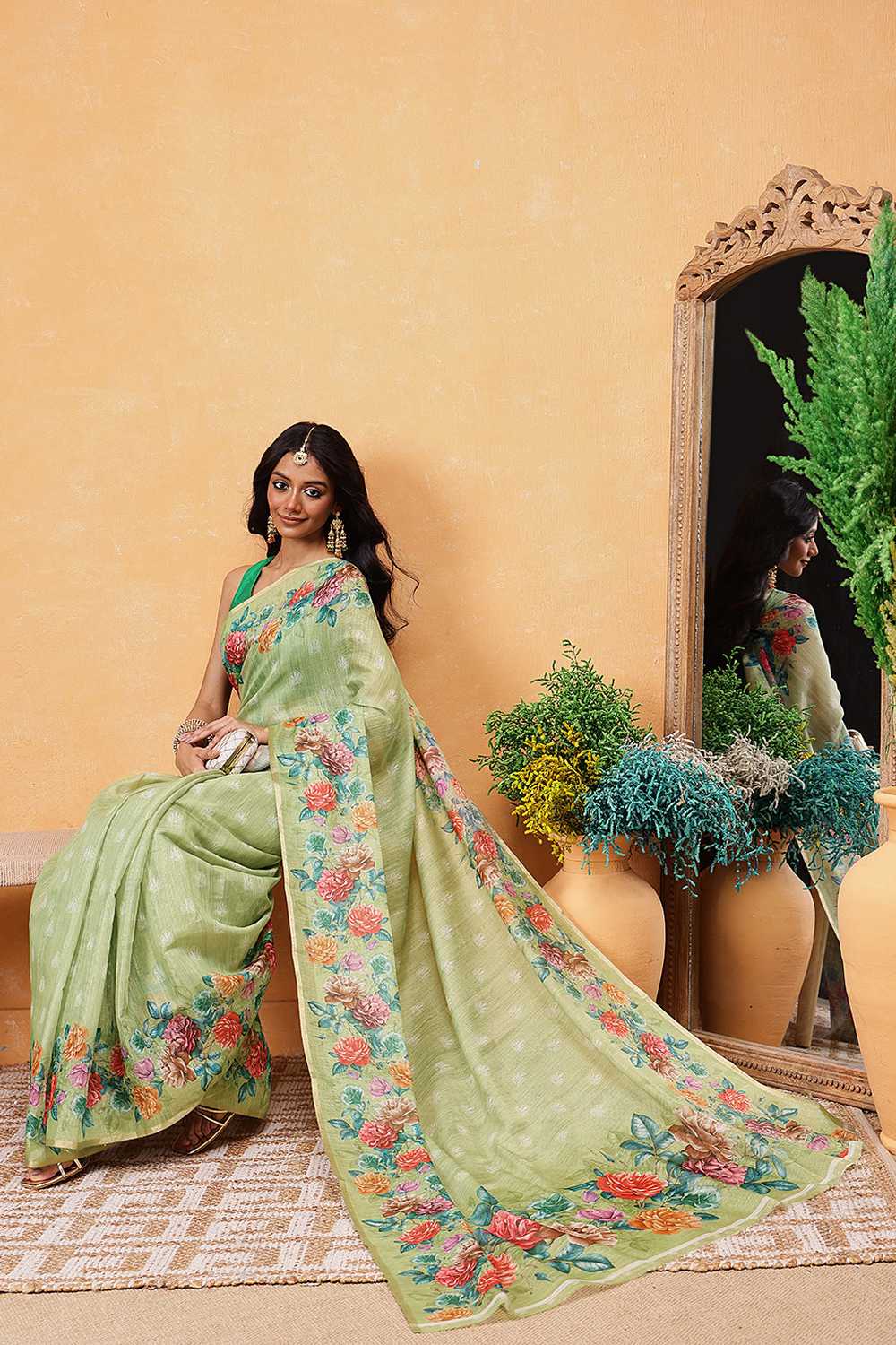 Elevate your wardrobe with our exquisite Ready to Wear Saree a masterpiece crafted to add timeless elegance to your style. Made from Cotton Blend this saree offers a perfect mix of comfort and sophistication. Adorned with Floral Printed it showcases intricate craftsmanship that speaks volumes of tradition and artistry. Perfect for Festive this saree is a versatile addition to your collection, ensuring you stand out effortlessly. Pair it with elegant Jewelry, for a glamorous look. Add Clutches or,potli Bags and complete the ensemble with Wedges & Heels making it a perfect choice for any event. Make a statement and embrace the elegance of Ready to Wear Saree today