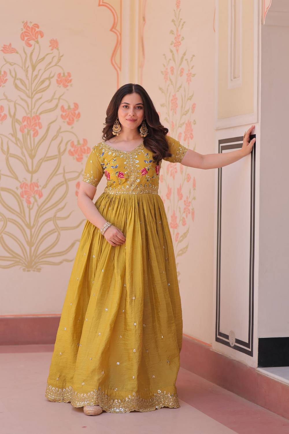 Stay stylish and comfortable with our Gown designed for all-day elegance. Made with Silk this set is perfect for easy movement and timeless appeal. The beautiful and intricate Embroidered elevates its design for Festive this kurti set is your go-to outfit. Pair it with elegant earrings and kolhapuri sandals or heels for a traditional look or wedges for a modern edge