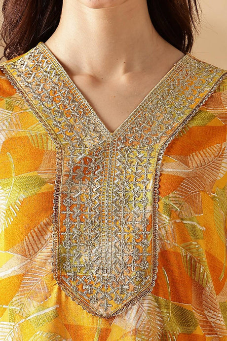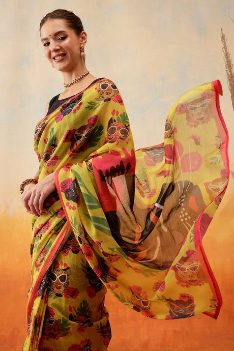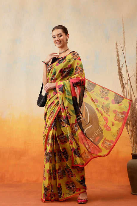 Mustard Animal Printed Cotton Blend Ready to Wear Saree