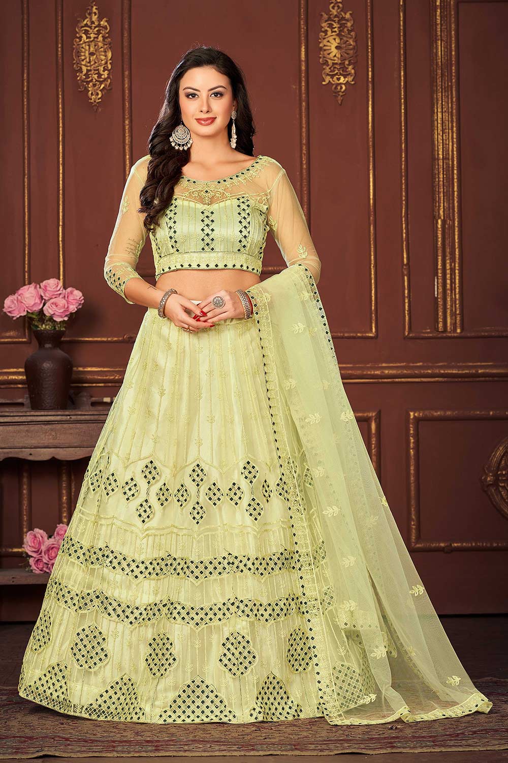 This Yellow Net Embroidery Round Neck Lehenga with a round neck and detailed embroidery offers an elegant and sophisticated look for any festive occasion.