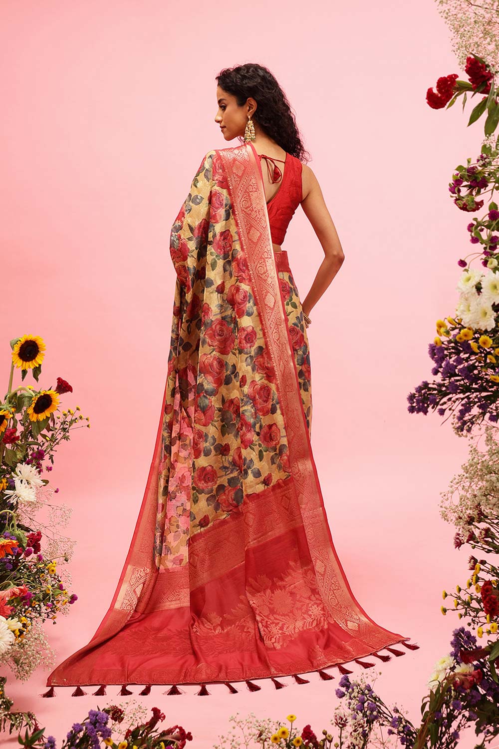Enhance your elegance with this Mustard Cotton Digital Print Banarasi Saree , showcasing rich woven details that reflect traditional artistry and luxurious style.