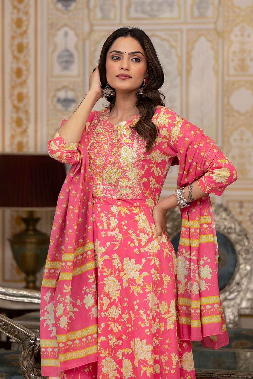 Pink Floral Print Zari Work Pure Cotton Kurti Pant Set