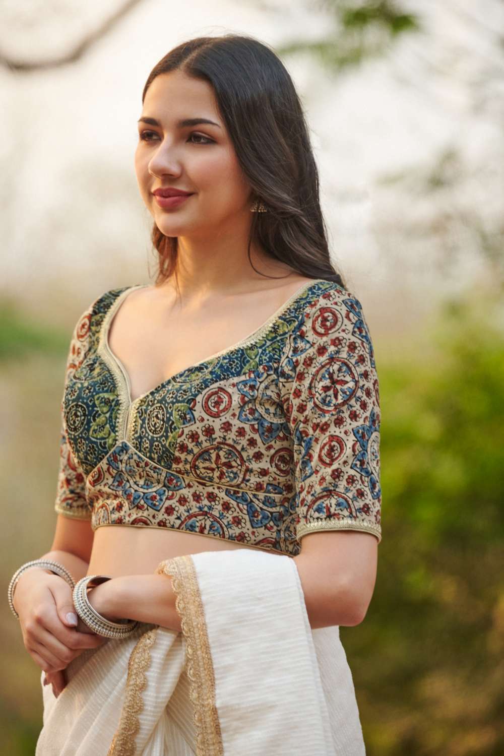Transform your saree look with our Blouse the ultimate blend of style and comfort. Made from soft and breathable Cotton it ensures a snug yet flexible fit. The intricate Ajrakh Printed make this blouse a wardrobe essential. Perfect for Casual it works beautifully with traditional or modern sarees alike. Team it with a silk saree, a bold necklace, and embellished sandals for a sophisticated look. Redefine your saree style with Blouse