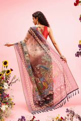 This Beige Cotton Blend Printed Madhubani Saree features detailed woven patterns that bring a touch of traditional beauty and luxurious refinement to your special occasions.