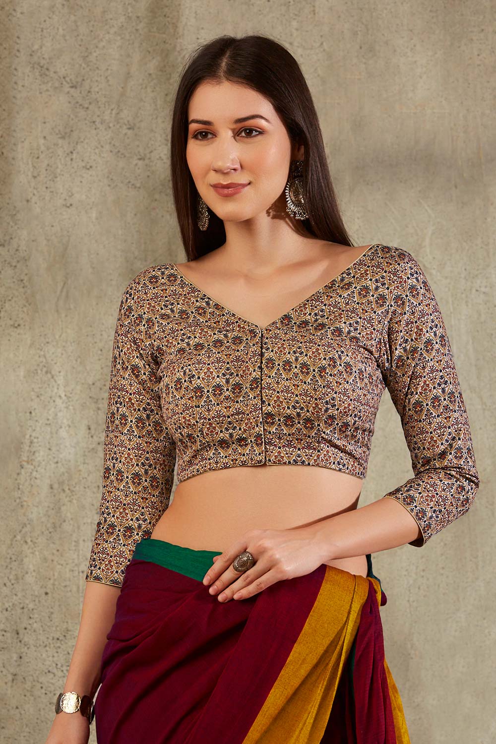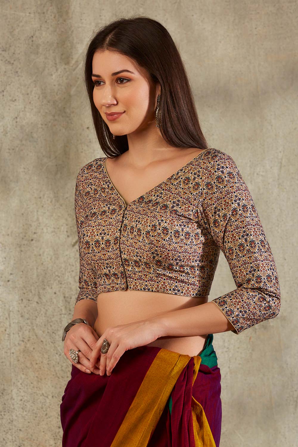 Beige Cotton Printed Three Quarter Sleeves Blouse