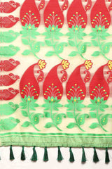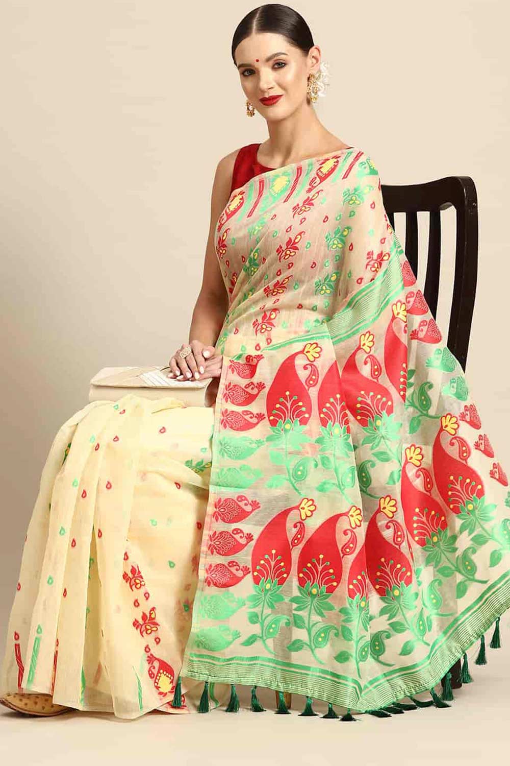 Elegant yet simple jamdani saree from Silk Land. Saree has a paisely design on pallu side for great look. There is no border.