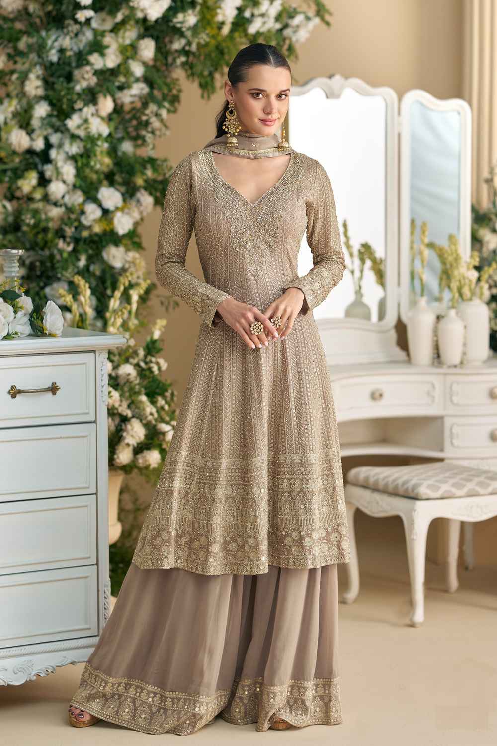 Beige Embellished Georgette Sharara Suit Set