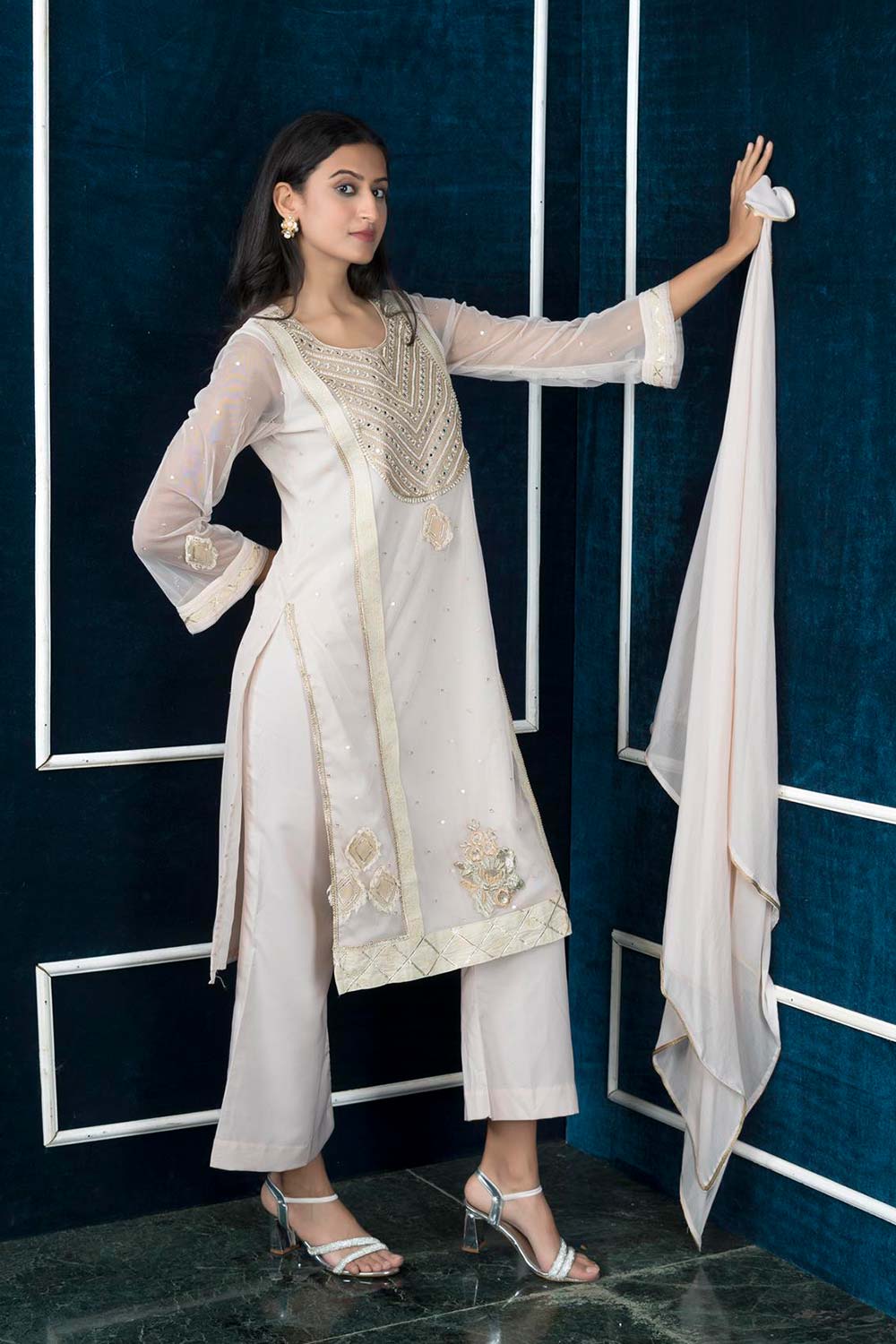 Beige Embroidered Net Stitched Palazzo Kurti With Dupatta