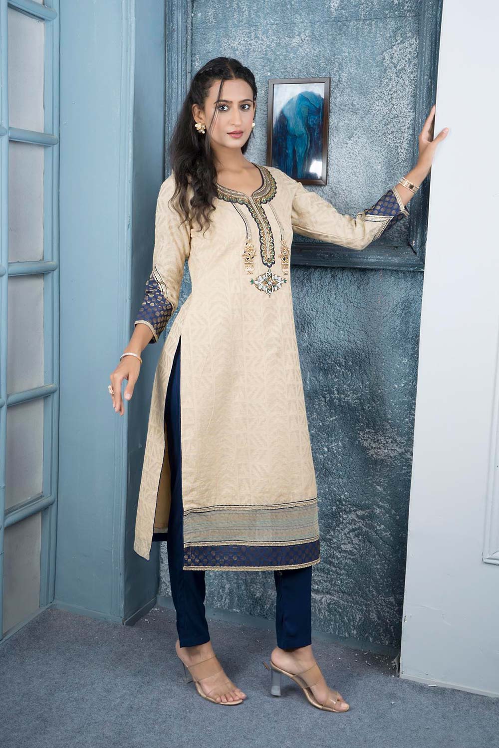 Beige Banaras Handloom Jacquard Silk Straight Cut Kurti With Contrast Brocade Detailing On 3/4 Sleeves And Hemline, Multi Colour Thread Double Stitching Detailing On Hemline , Hand Embroidered Swarovski And Zardozi Neckline With Gold And White Pearls In Encrusted With Gold Lace Detailing On Sleeves, Neckline And Hemline, Contrast Navy Blue Pencil Piping Backing On Side Slits To Give A Perfect Finished Look. Worn With Navy Blue Cigarette Pants And.