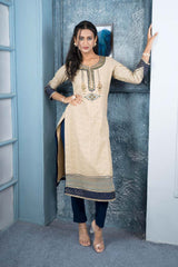 Beige Embroidered Silk Straight Cut Kurti Kurti Pant Set