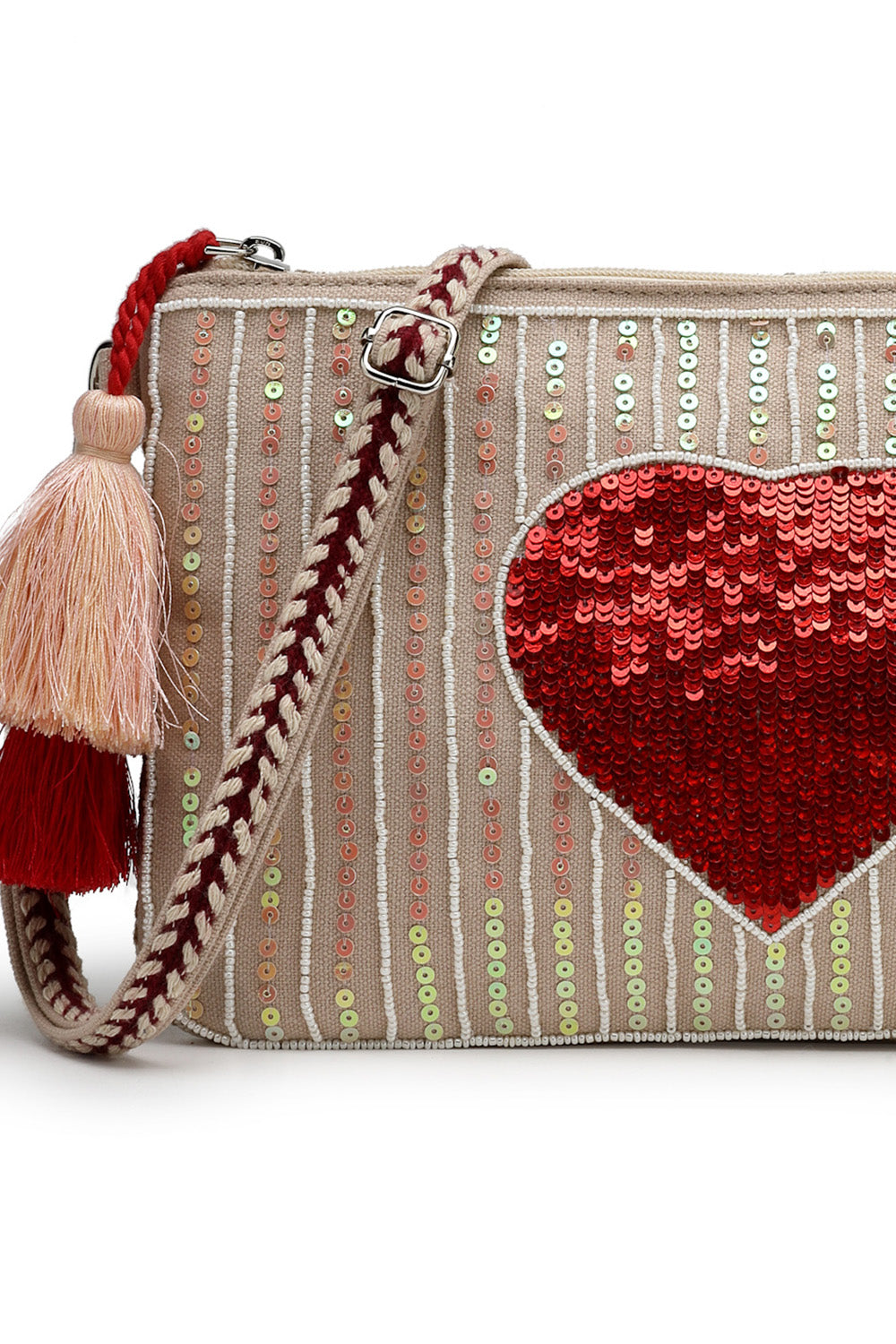 Beige Heart Embellished Cotton Canvas & Jacquard Sling Bag