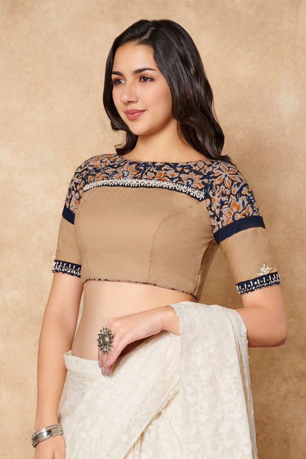 Beige Kalamkari Printed Cotton Boat Neck Blouse