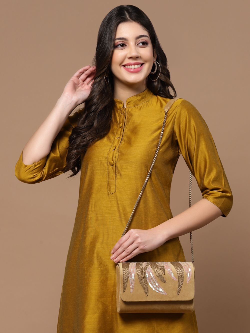Beige Suede Abstract Embellished Clutch