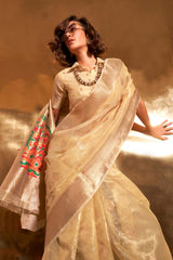 The saree is crafted from tissue fabric, known for its lightweight, airy texture and subtle luster. The base color is beige.
