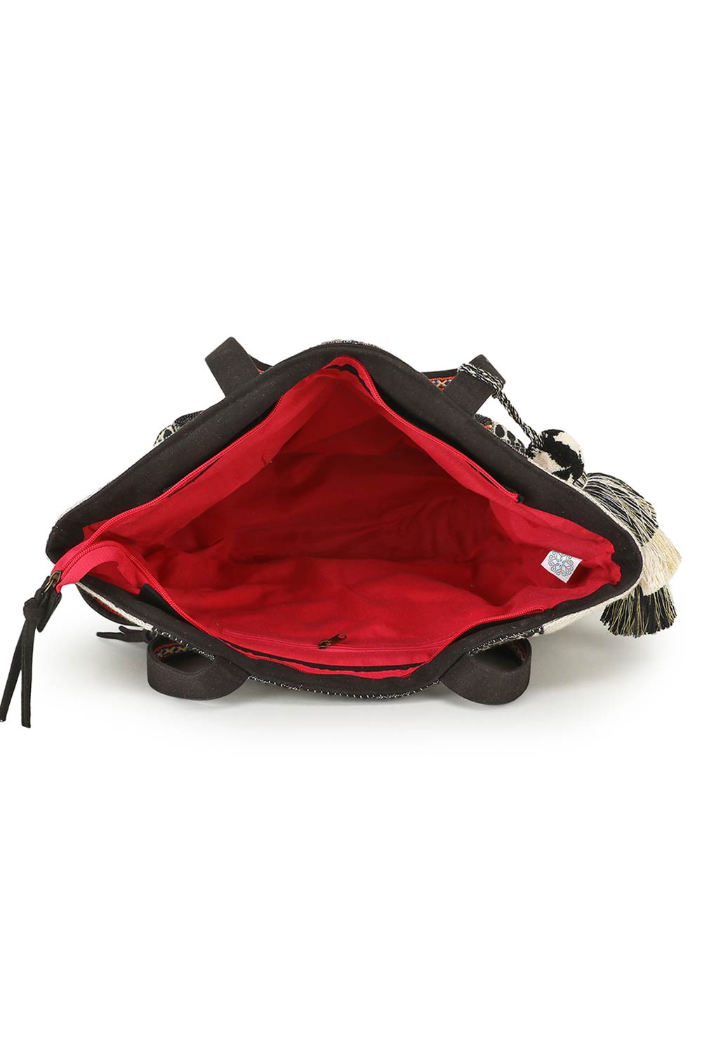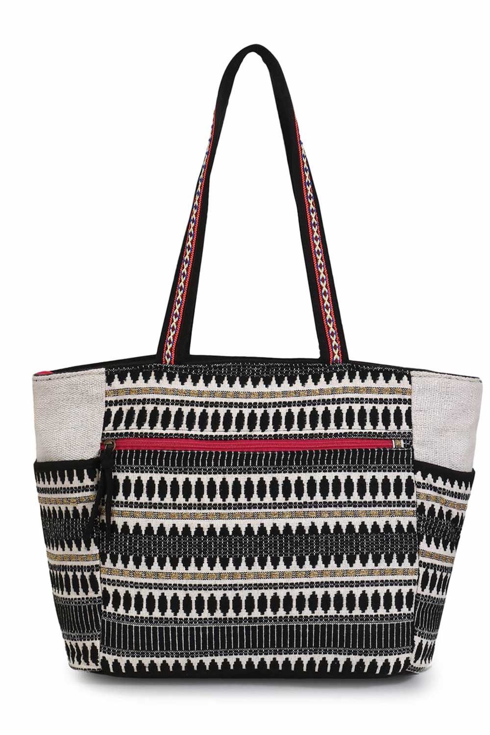 Enrich your look with this Natural & Black & Multicolor Tote Bag from Anekaant's Boho Collection. Crafted in Acrylic Jacquard & Cotton Canvas fabric & this bag features a Trellis Embellished pattern decorated with Tassells. It has Two Handles and 1 main compartment secured with a Zipper closure. It has 3 external pockets and 1 inner pocket.