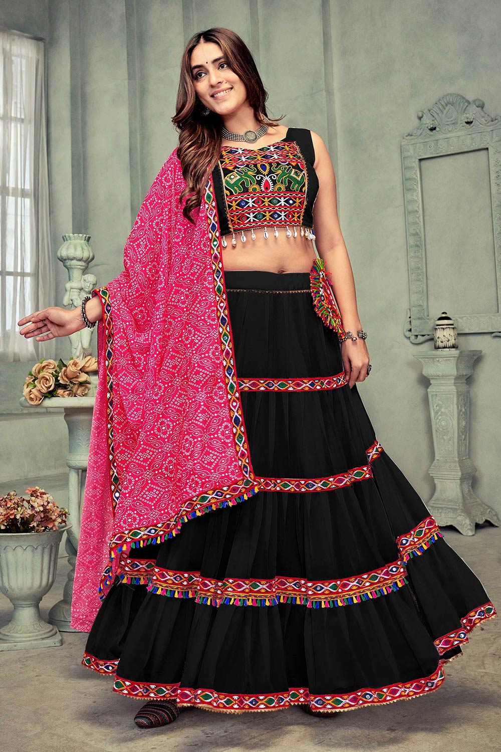 Black And Pink Georgette Embroidered Lehenga Choli with Dupatta