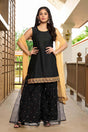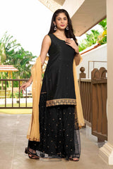 This exquisite cotton embroidered Sharara suit set features intricate threadwork that adds a regal touch. The soft, breathable fabric offers comfort and style, making it perfect for festive occasions or formal gatherings.