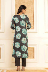Black Floral Print Thread Work Pure Cotton Kurti Pant Set