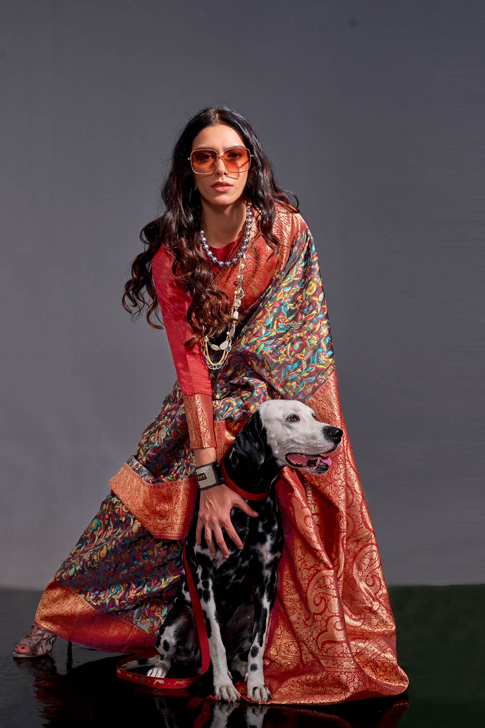 The saree is made from modal, a semi-synthetic fabric known for its softness, breathability, and elegant drape.