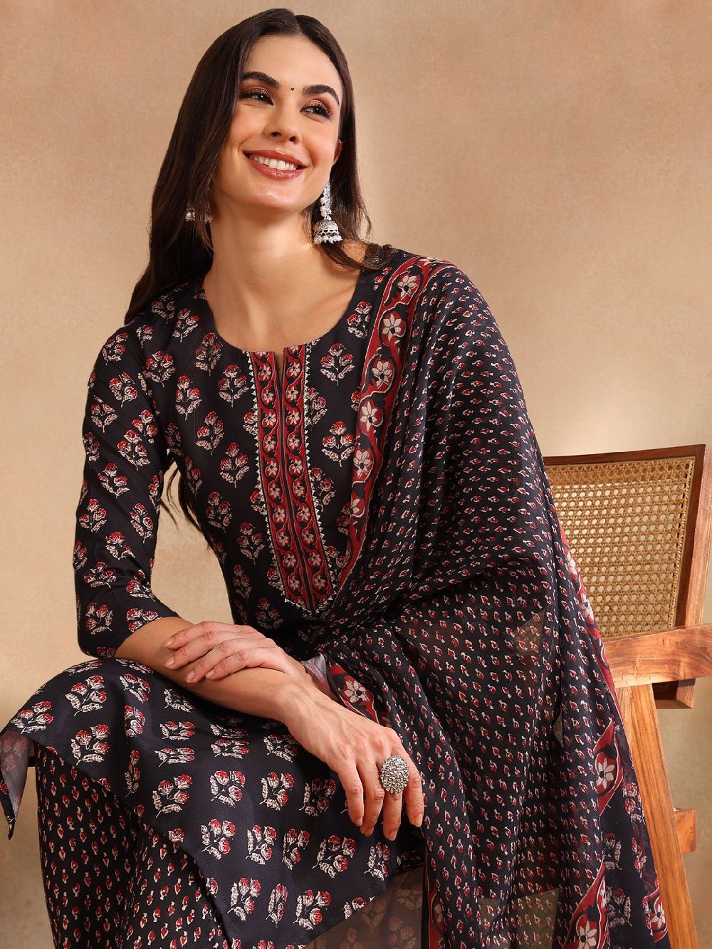 Black Rayon Blend Floral Printed Straight Kurti Pant With Dupatta