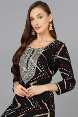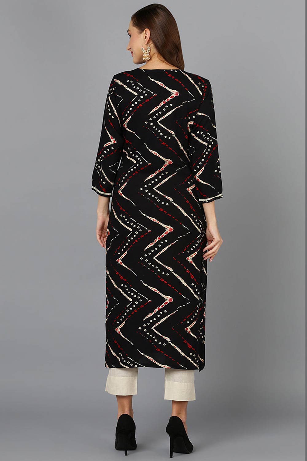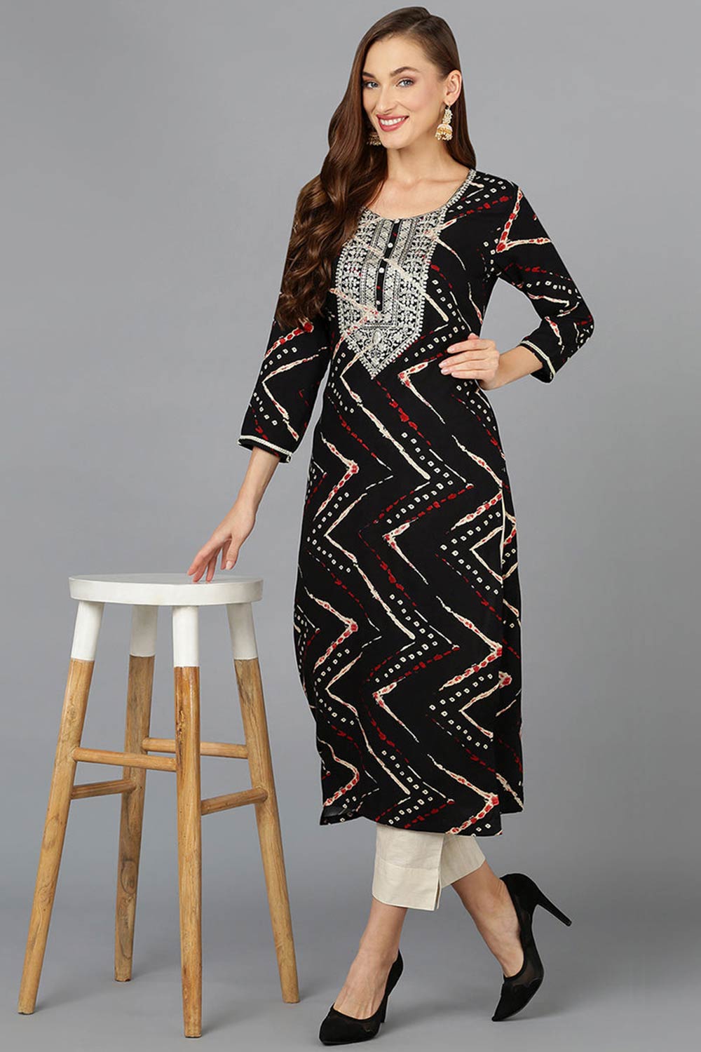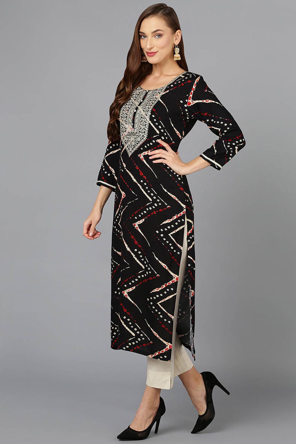 This Black Rayon Printed Straight Kurti is a timeless choice for any occasion. The intricate prints add a touch of sophistication to the ensemble, while the comfortable rayon fabric ensures effortless elegance and ease throughout the day.