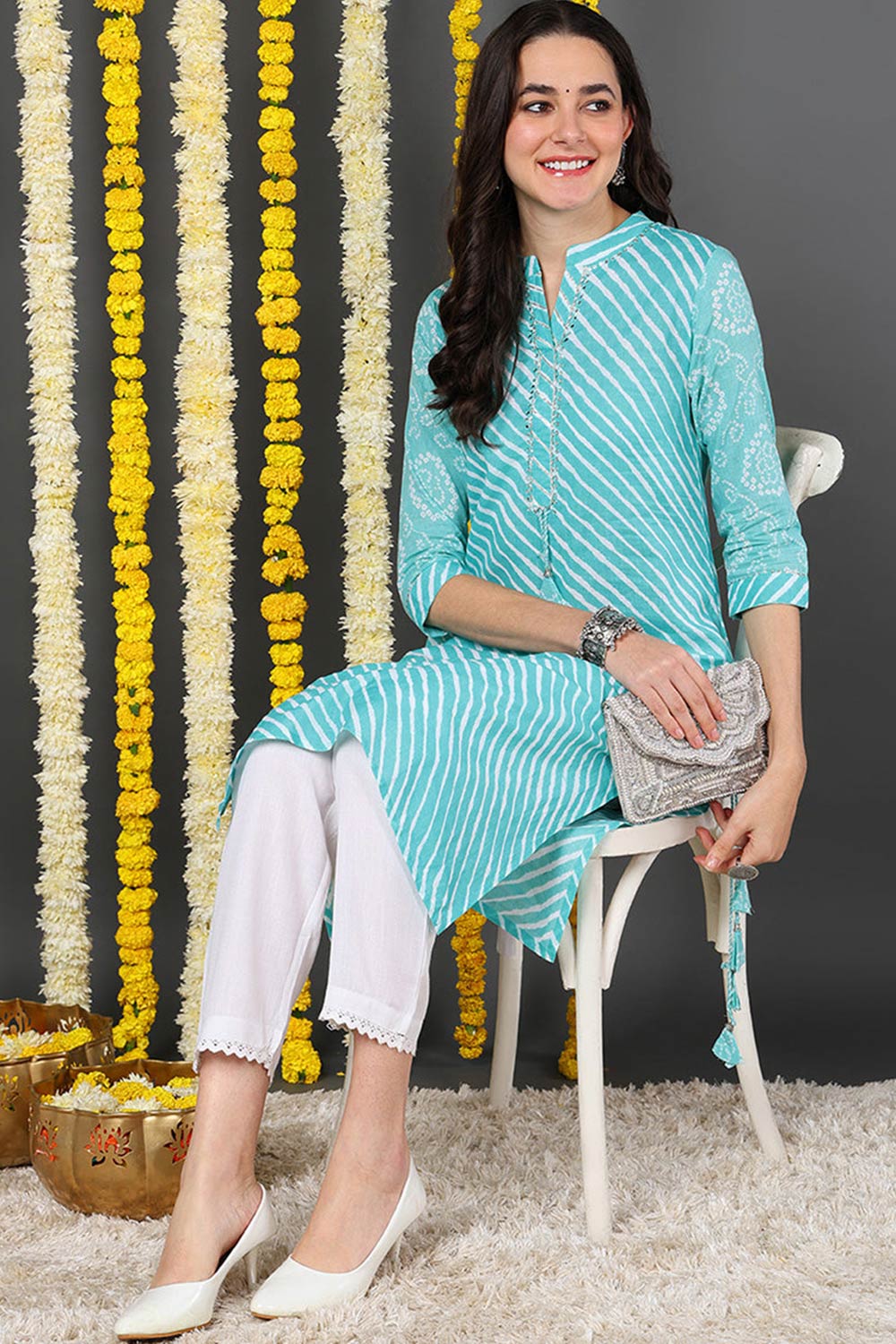 This Blue Cotton Mandarin Collar Kurti is a timeless choice for any occasion. The intricate prints add a touch of sophistication to the ensemble, while the comfortable rayon fabric ensures effortless elegance and ease throughout the day.