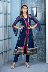 Blue Embroidered Georgette Anarkali Kurti Pant Set