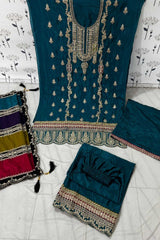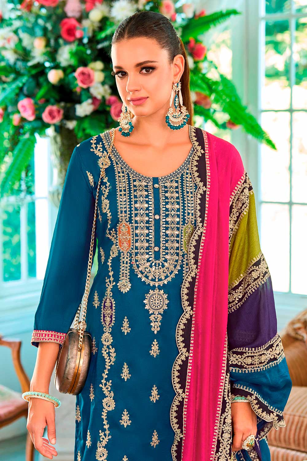 Step into effortless style with our Palazzo Suit Set crafted for the modern woman who cherishes tradition. Made from soft Chinon it keeps you comfortable all day long. The Embroidered on the design lends a touch of sophistication to your outfit. Perfect for Festivewear,Mehendi,Reception, this Palazzo Suit Set is a must-have for versatile styling options. Style it with minimalistic accessories and flats for a casual look or jewelry and heels for special events