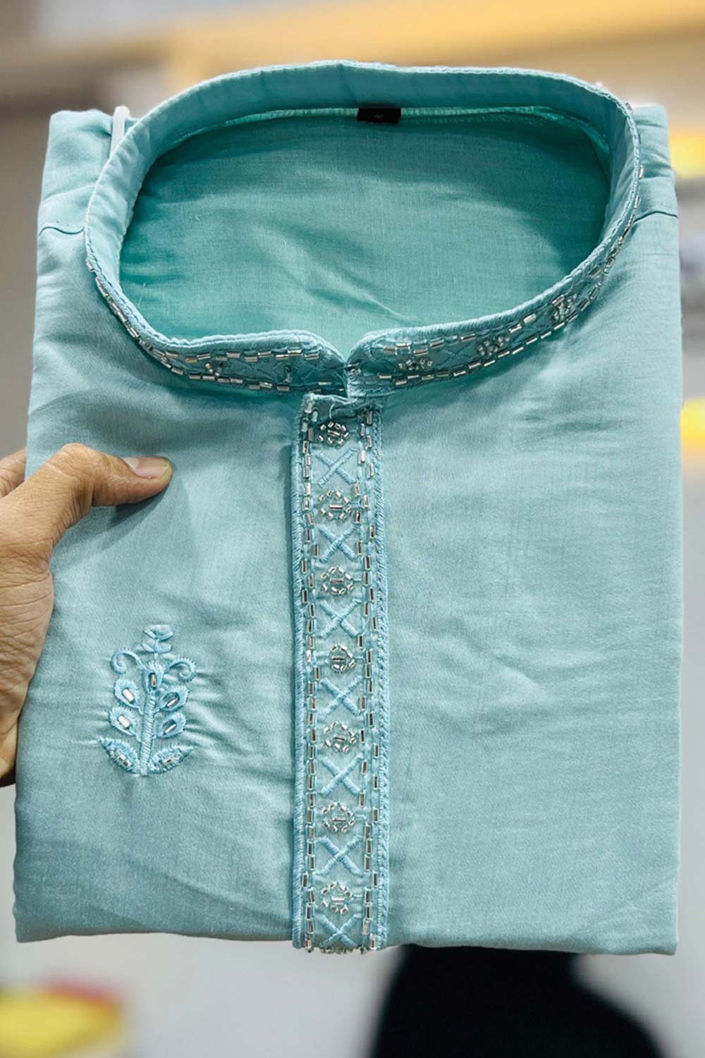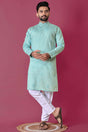 Dress him in elegance with our Kurta Pajama Set, a classic Kurta Set designed for timeless style. Crafted from soft Silk it offers a comfortable fit for all-day wear. The intricate Embroidered on the Kurta adds a traditional touch to this outfit. Perfect for festivewear this Kurta Set is a versatile choice for any festive or formal occasion. Pair it with white churidar pants and traditional juttis for a complete ethnic outfit. Make every moment special with the charm of Kurta and Pajama Set