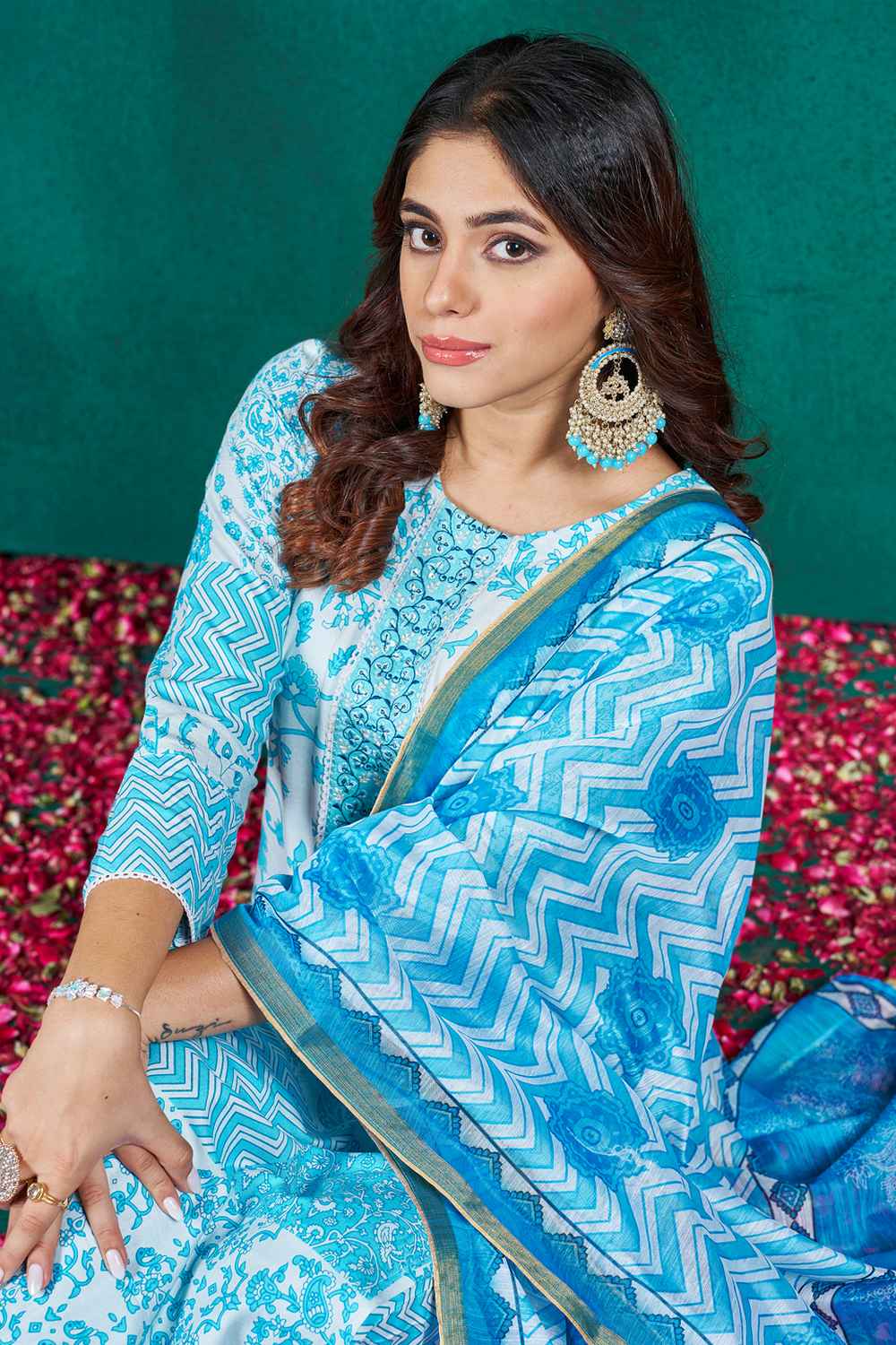 Teal Green Cotton Ethnic Printed Straight Kurti