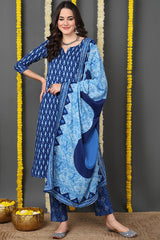 Blue Rayon Blend Ethnic Motifs Printed Straight Cut Suit Set