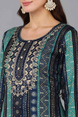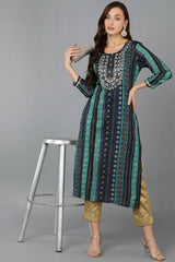 This Blue Rayon Embroidered Round Neck Kurti is a timeless choice for any occasion. The intricate prints add a touch of sophistication to the ensemble, while the comfortable rayon fabric ensures effortless elegance and ease throughout the day.