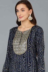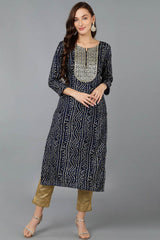 This Blue Rayon Embroidered Round Neck Kurti is a timeless choice for any occasion. The intricate prints add a touch of sophistication to the ensemble, while the comfortable rayon fabric ensures effortless elegance and ease throughout the day.