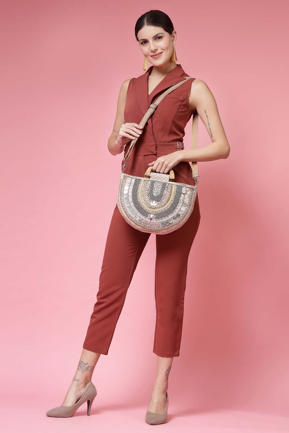 Anekaant Boho Camel Brown And Gold Ethnic Embellished Cotton Jacquard Hand Bag