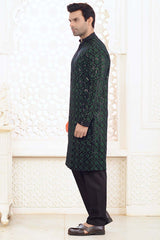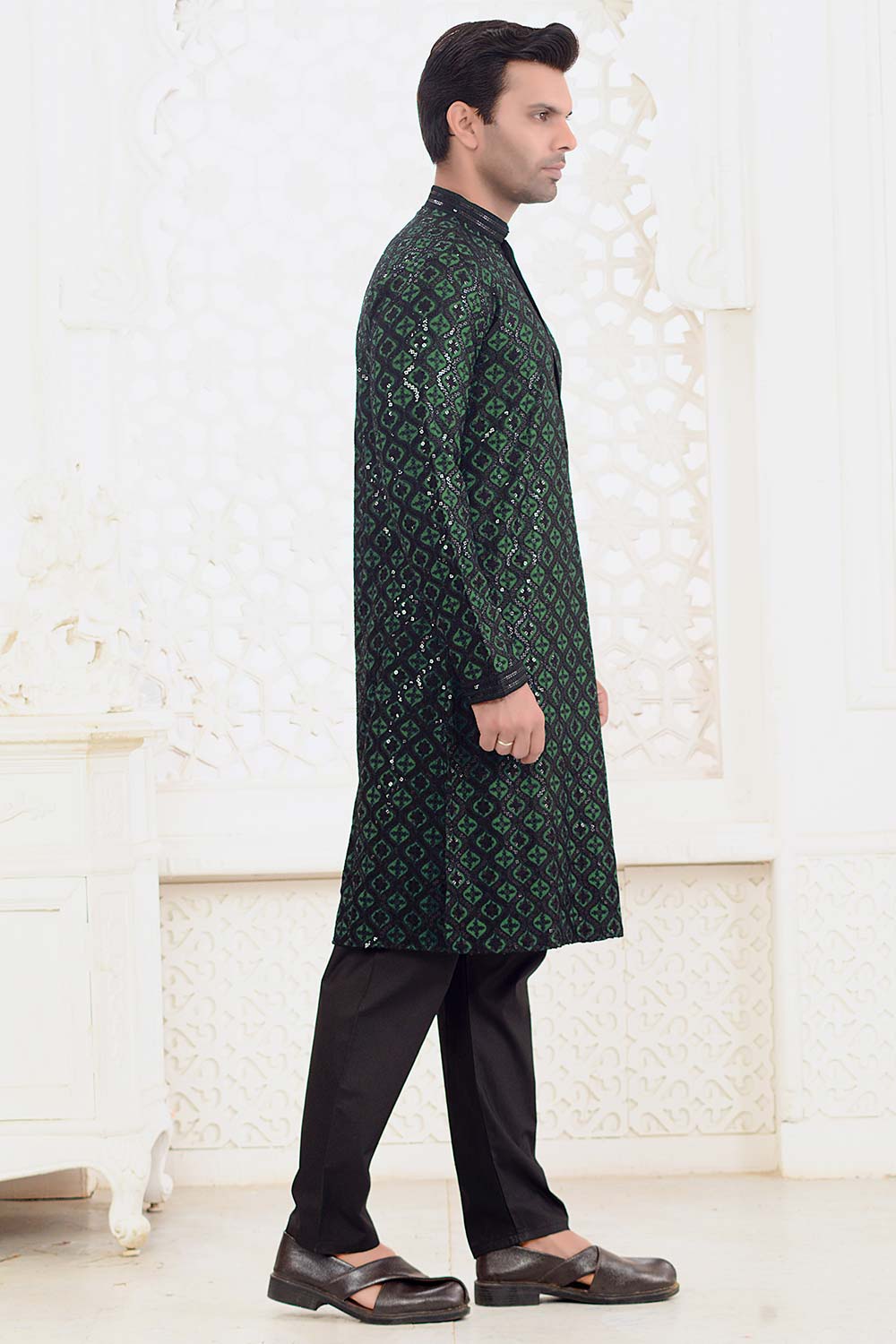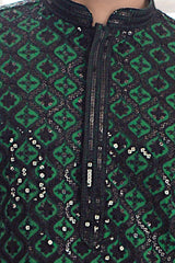Experience classic elegance with this Bottle Green Cotton Kurta Pajama Set, embellished with stunning sequin work that exudes a timeless charm.