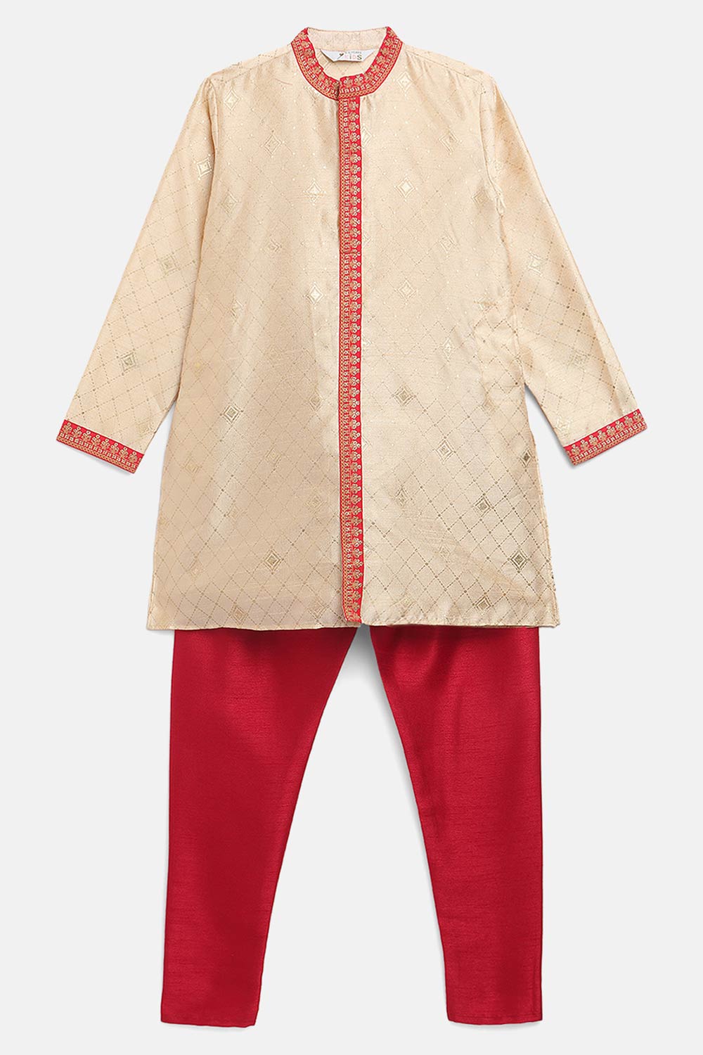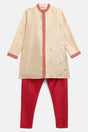 Boys Beige Poly Silk Gold Print Kids Kurta Churidar Set