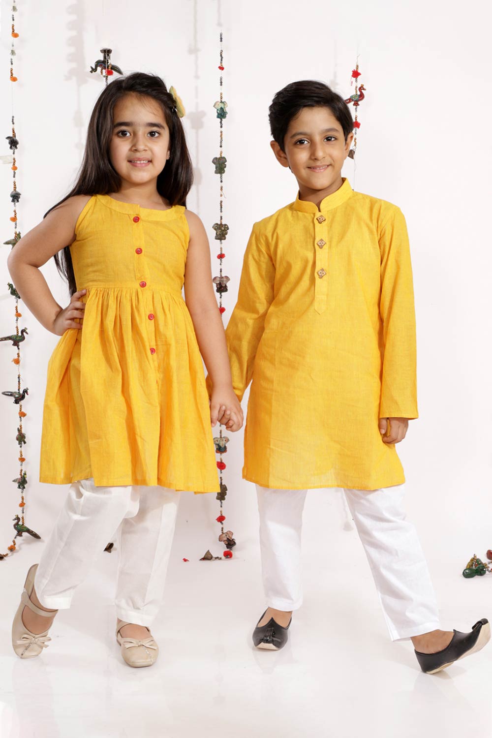Boys Yellow And White Pure Cotton Kurta Pajama Set & Girls Cotton Kurta And Straight Pant Set