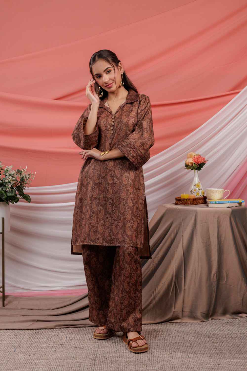 Grab attention with ease with our Brown Paisley Cotton Co-Ord Set,the ultimate in coordinated chic. Crafted from good quality of Cotton this set is designed for comfort and style.Featuring a sleek and Paisley,itƒ??s perfect for creating an on-trend, put-together look.Be it a brunch outing, a casual day at work or Casual,this co-ord set fits any setting. Pair it with chunky sneakers and minimal jewelry for a cool vibe, or pair it with heels and bold accessories.