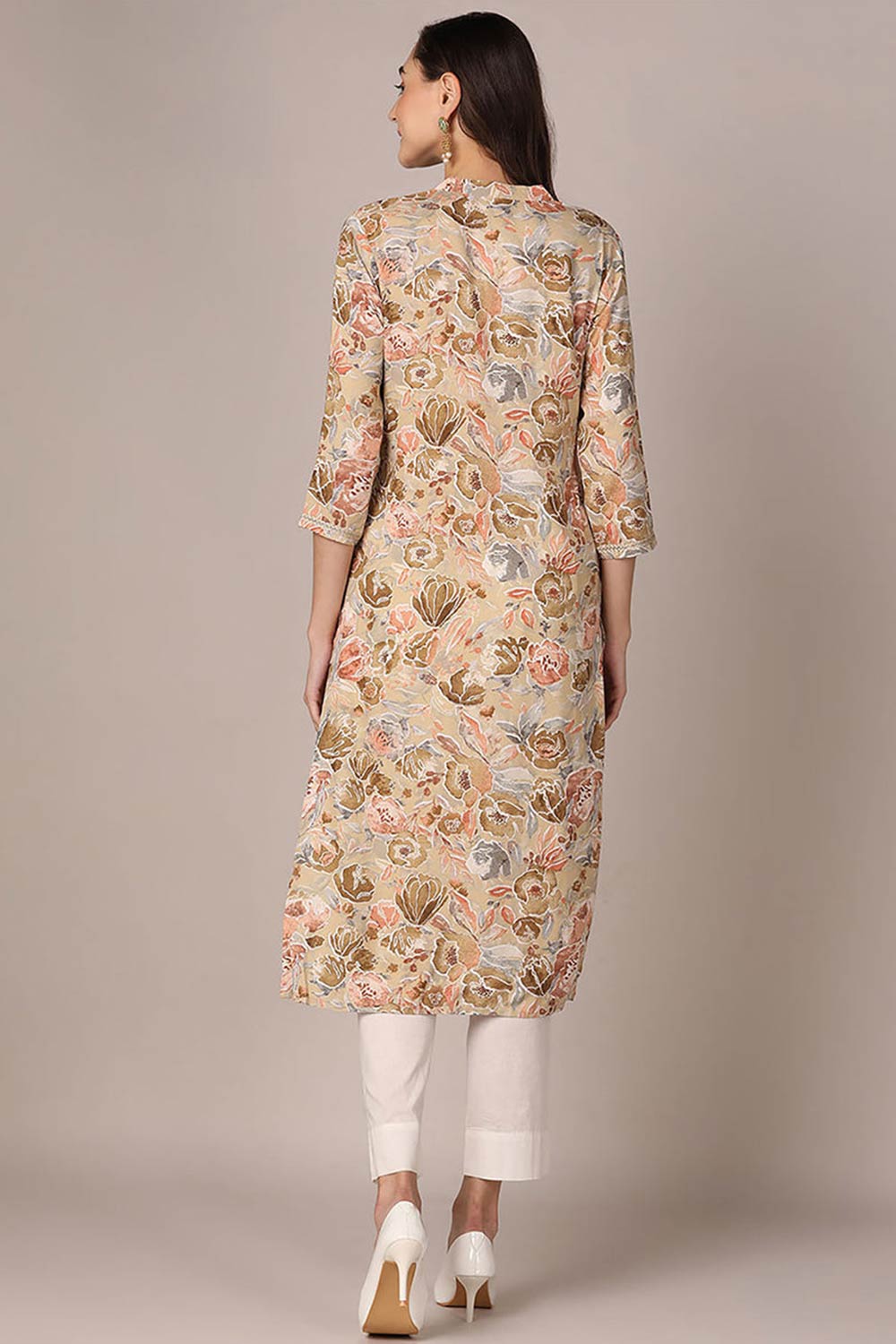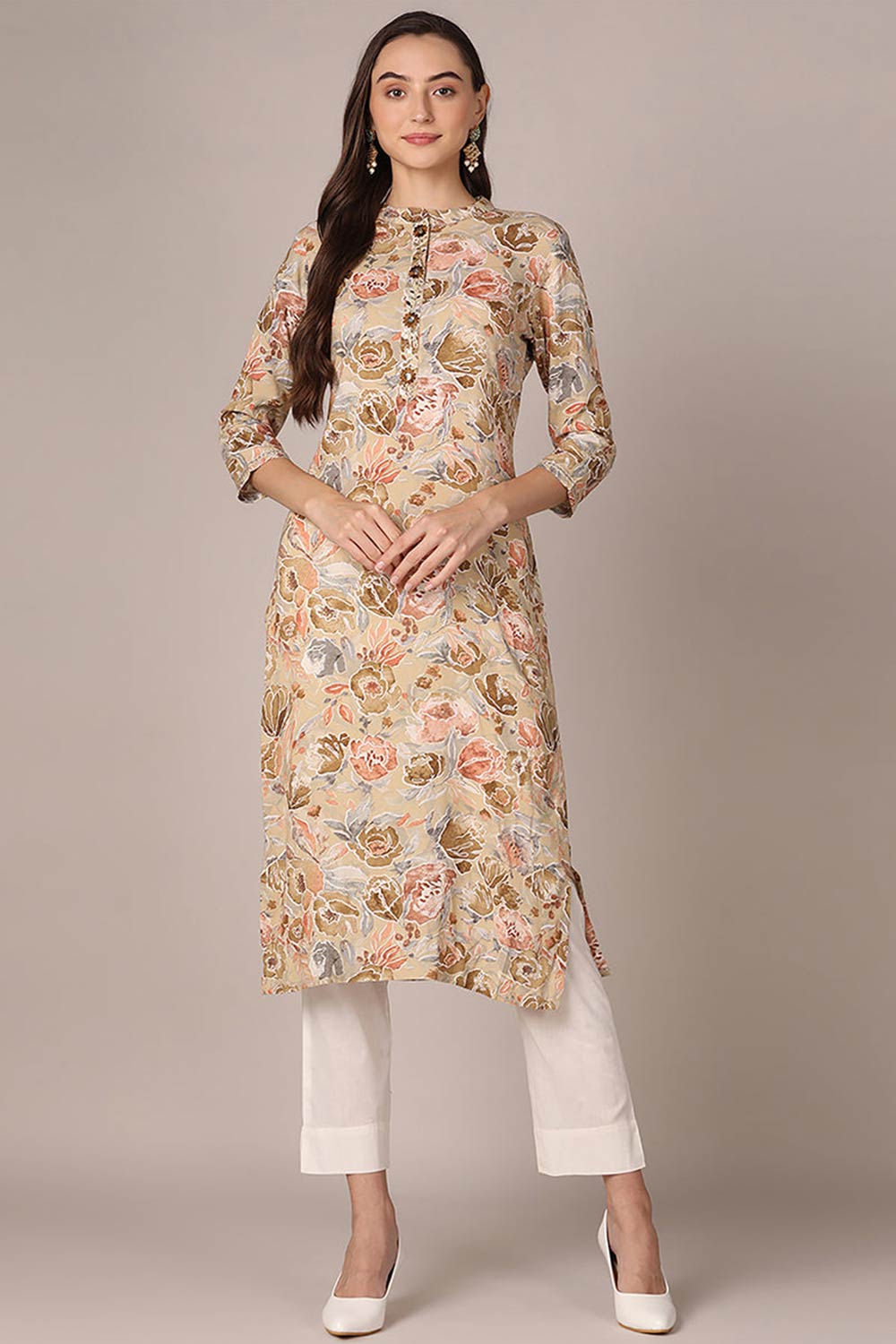 Brown Rayon Floral Print Mandarin Collar Kurti