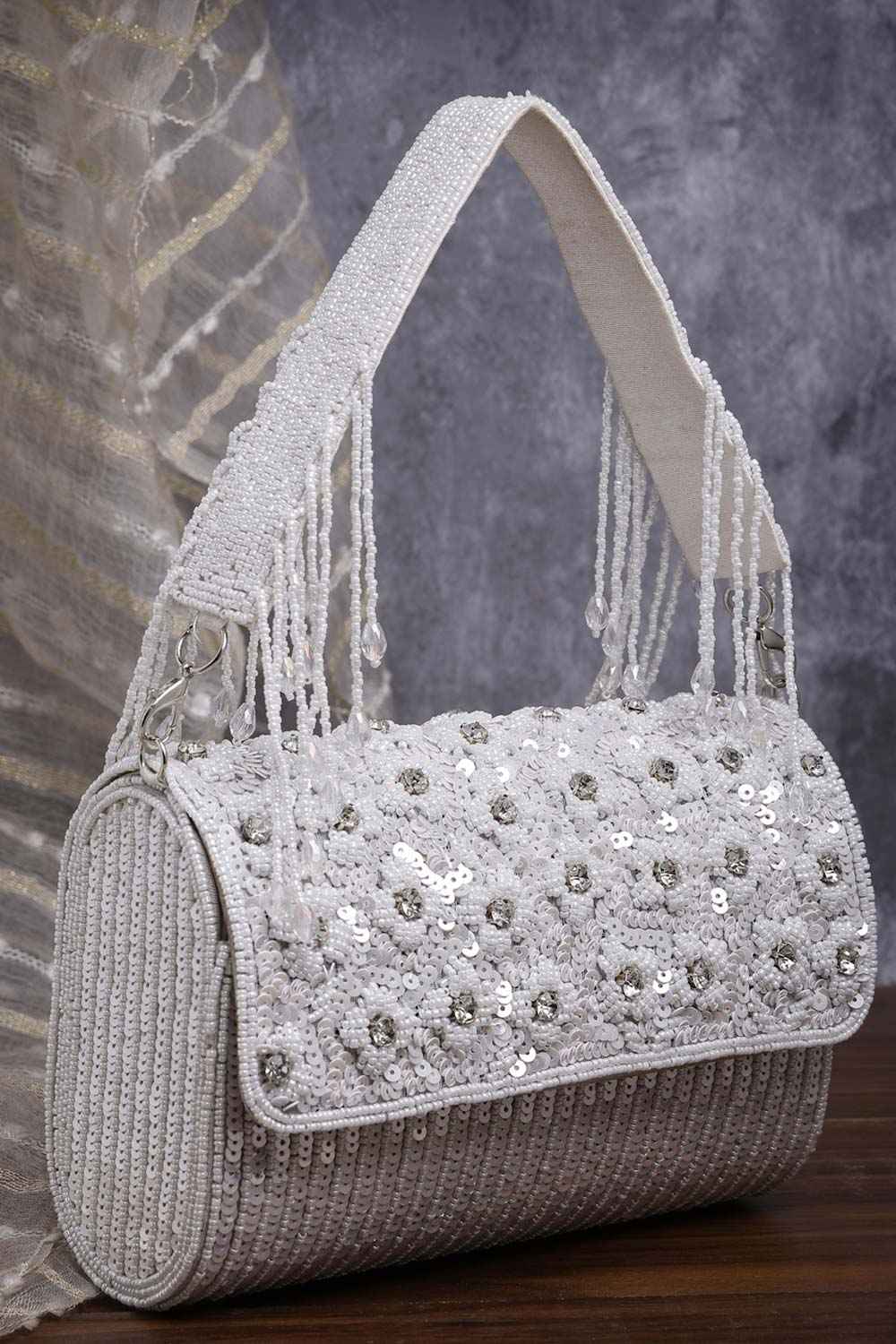 Silver And White Clutch from Anekaant's Coffer Collection. This Foldover Clutch is crafted with the finest Faux Silk Fabric and features a Hand Crafted Floral Embellished Pattern decorated with Tassels. Has a Sturdy and Detachable Wrist loop. Has one Main Compartment secured with a Magnetic Button Closure. Includes 1 Patch Pocket and offers ample space for all your essentials like a phone, makeup, keys etc. Dimensions (LxHxW): 18 x 12.5 x 6 cm
