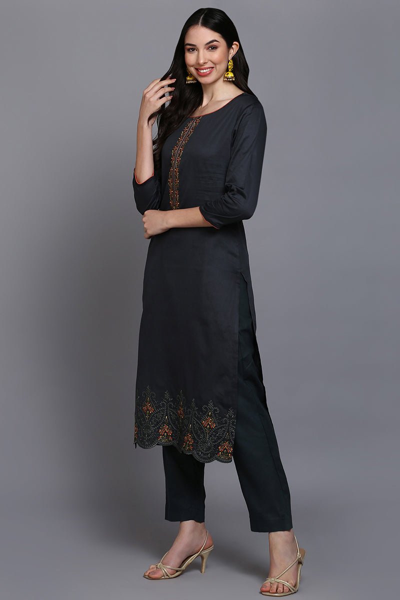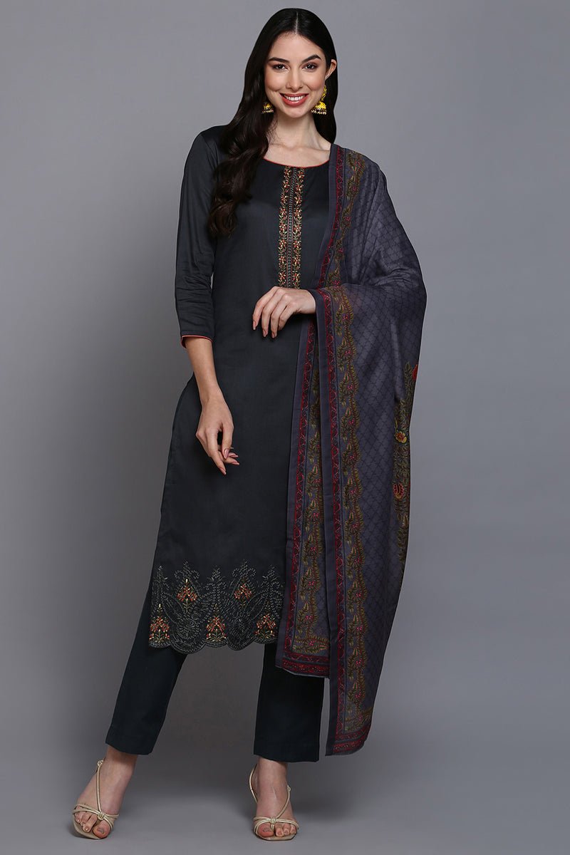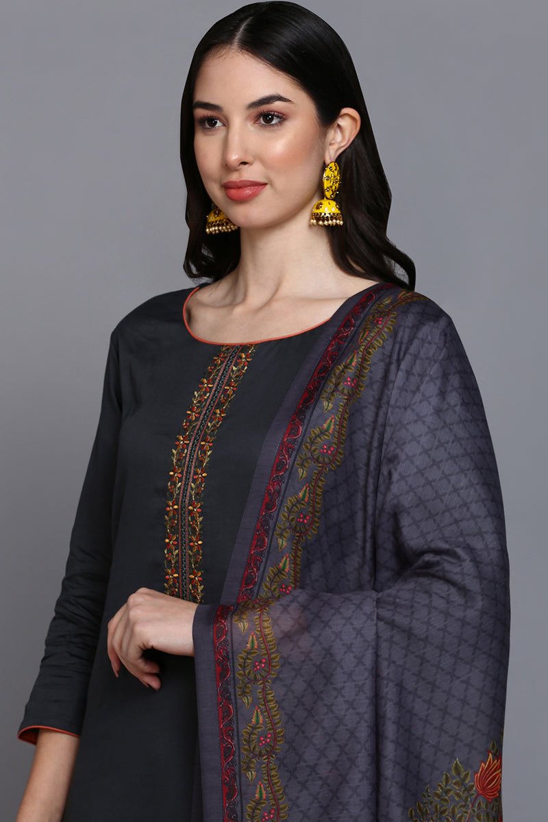 Cotton Grey Embroidered Straight Kurti Pant With Dupatta