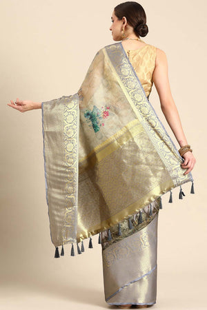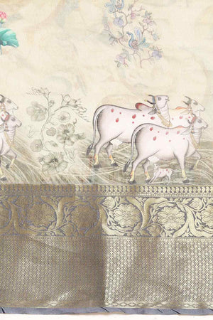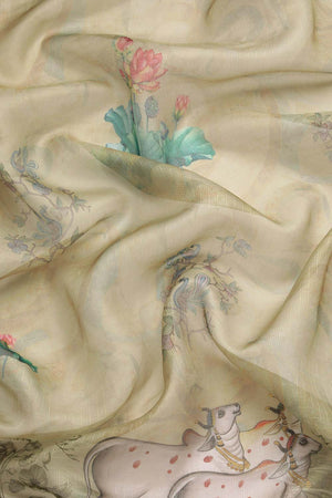 Cream Pichwai Muga Silk Digital Print Saree With Unstitched Blouse Piece