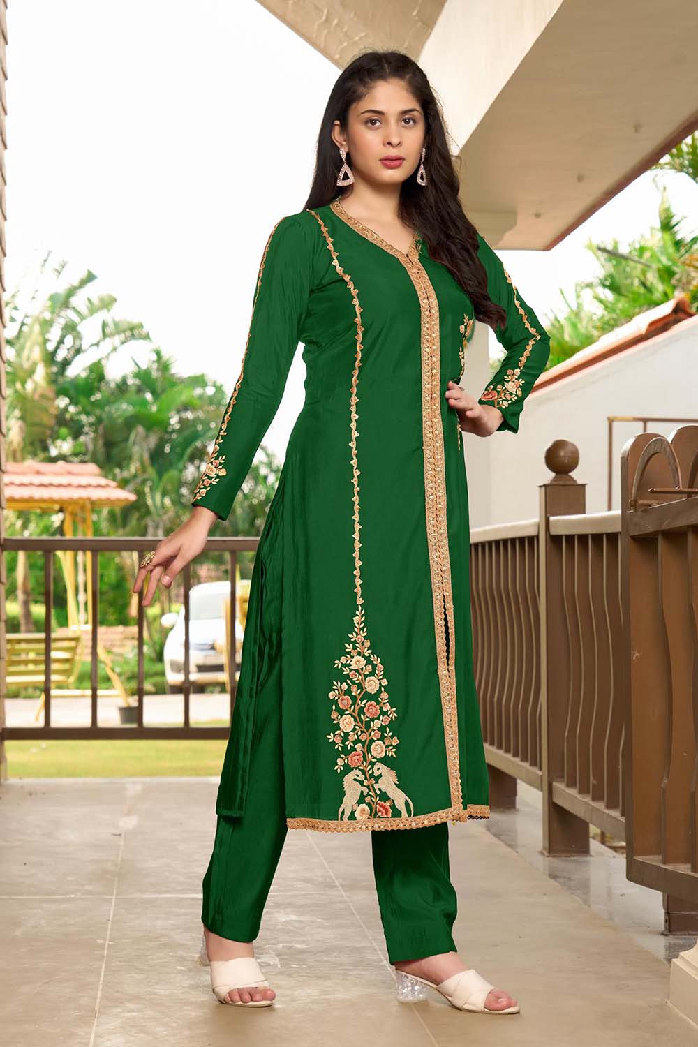 This deep Dark Green art silk dress featuring resham machine embroidery complimented with embellishments, paired with art silk pants .