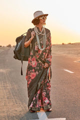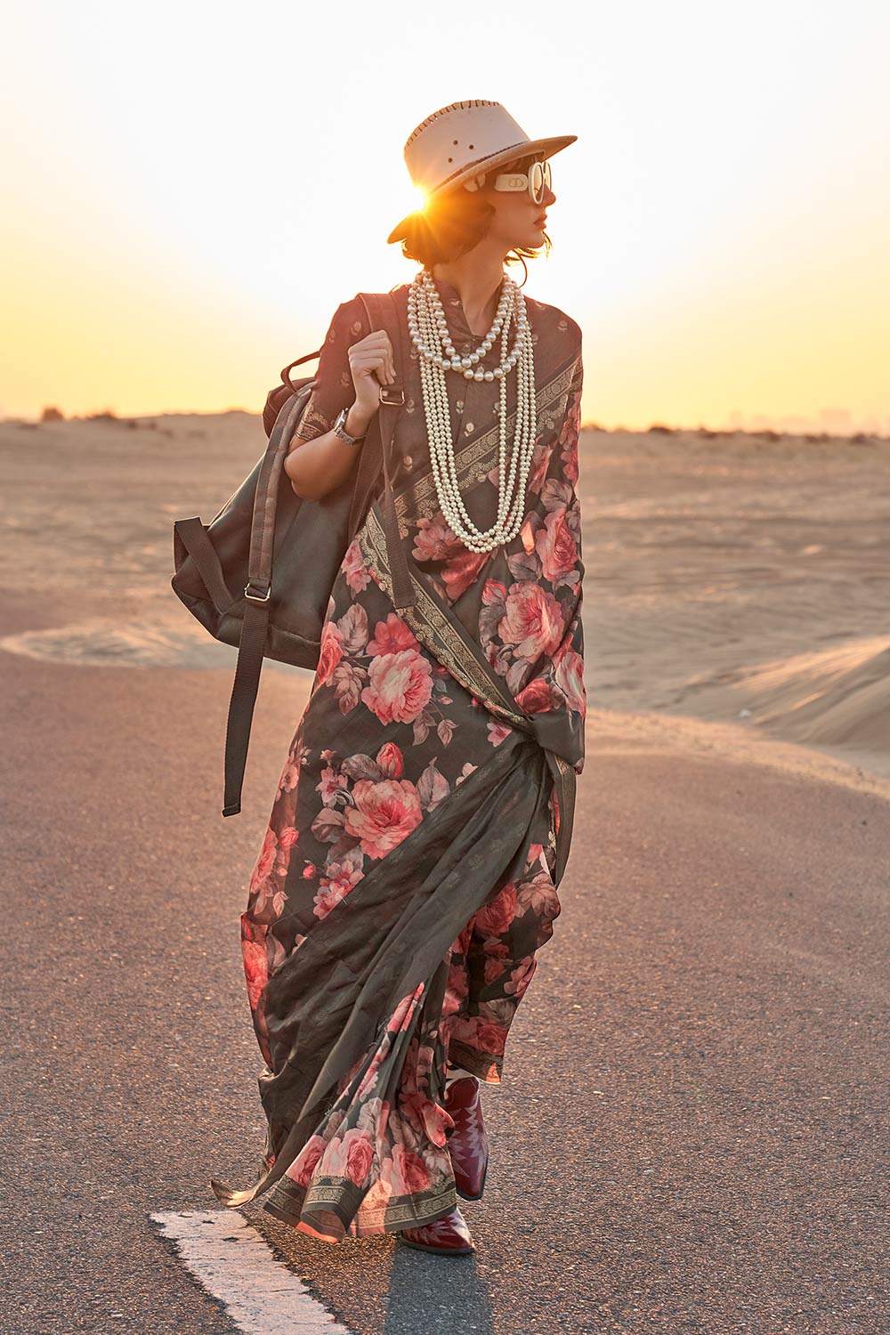 The saree is made from silk, known for its smooth, lustrous finish and luxurious drape. The base color is dark green.
