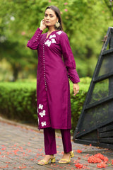 Dark-Pink Hand Embroidery Art Silk Straight Cut Kurti Pants Set