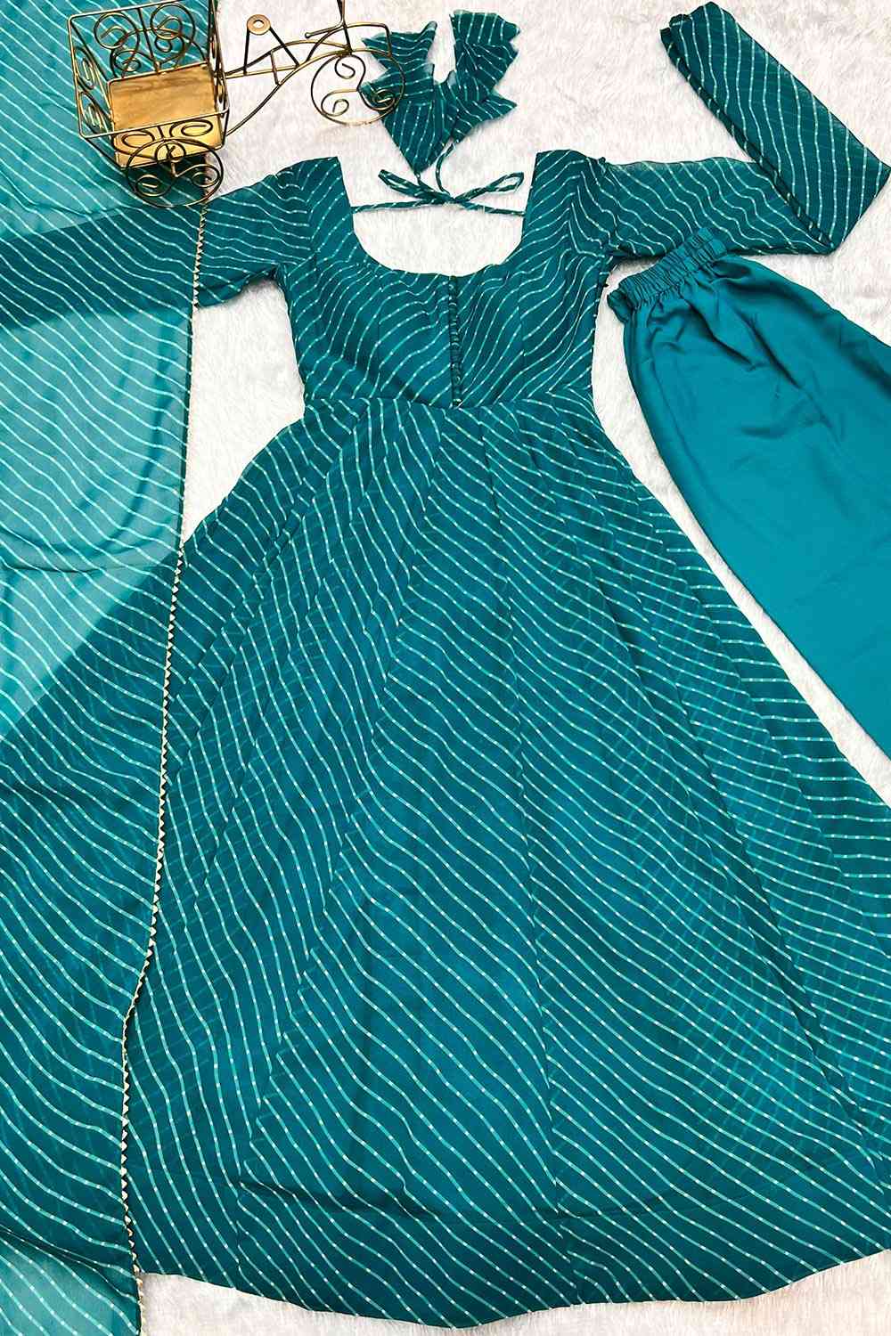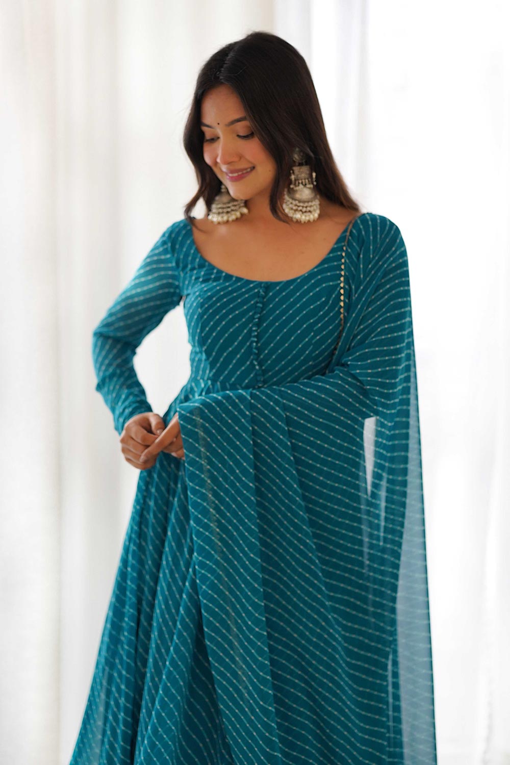Discover elegance and grace with this exquisite Anarkali kurti set, crafted from luxurious faux georgette fabric. Featuring a vibrant laheriya print and a fully flared silhouette, this ensemble is designed to make a stylish statement at any special occasion.