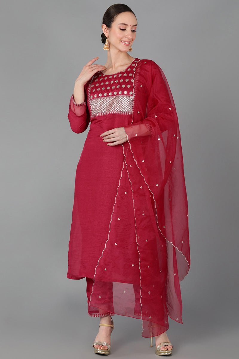Fuchsia Poly Silk Straight Kurti Pant With Dupatta