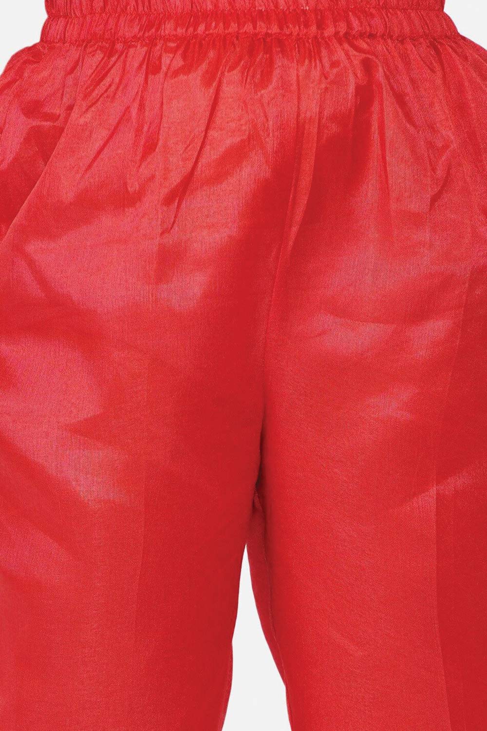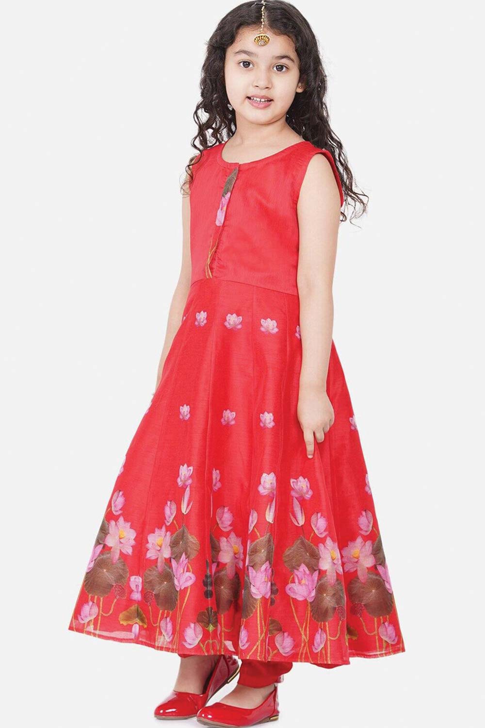 Girl's Red Ethnic Motifs Printed Chanderi Cotton Kurta With Churidar And With Dupatta