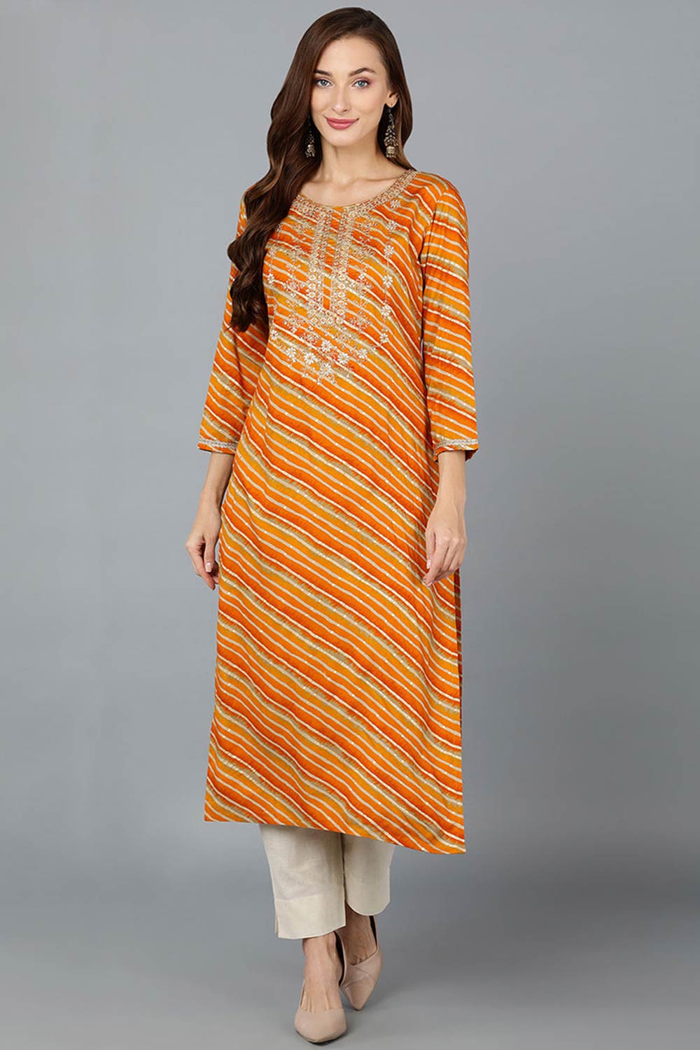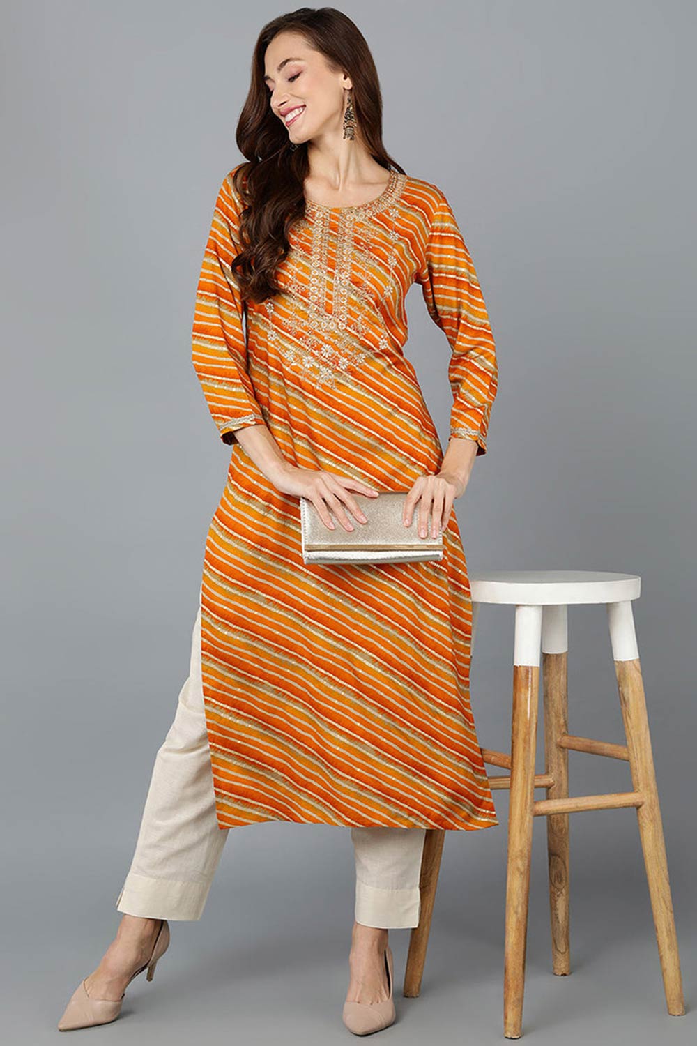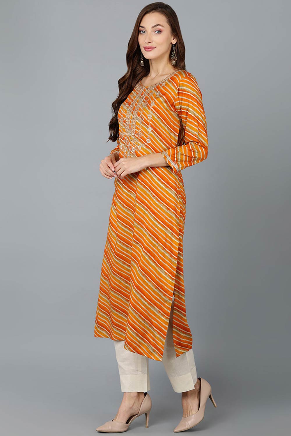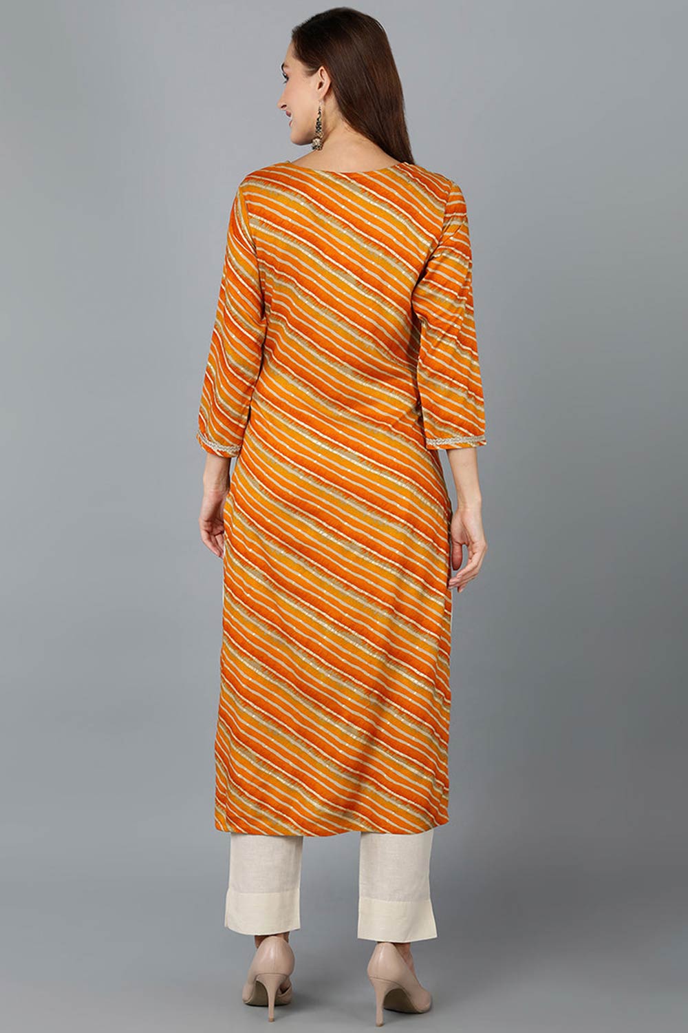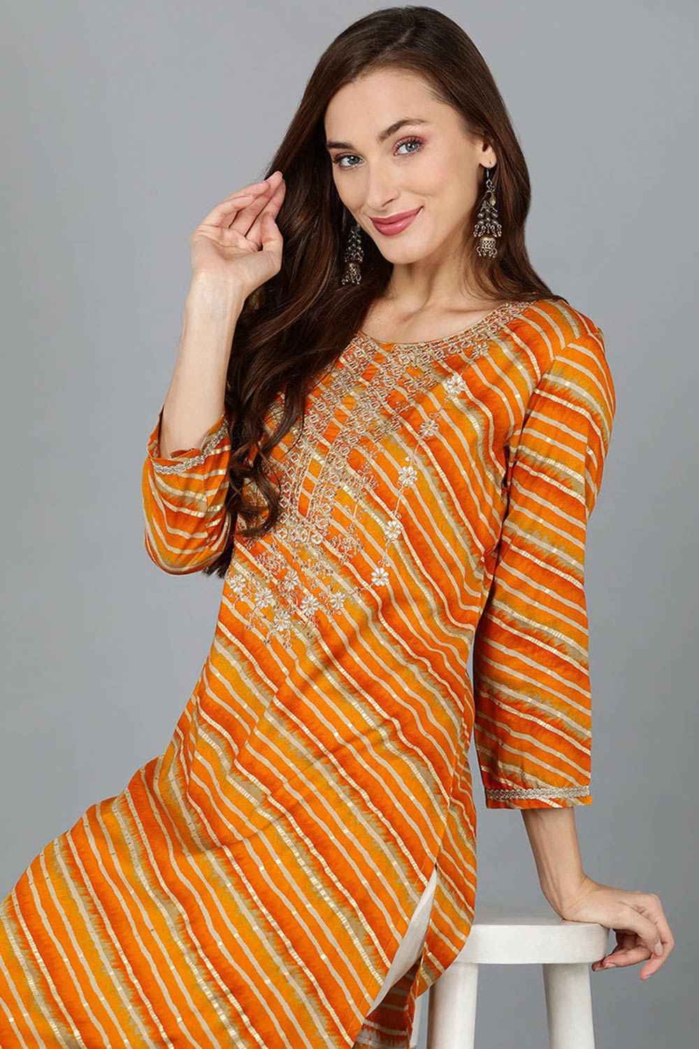 This Gold Silk Blend Round Neck Kurti is a timeless choice for any occasion. The intricate prints add a touch of sophistication to the ensemble, while the comfortable rayon fabric ensures effortless elegance and ease throughout the day.
