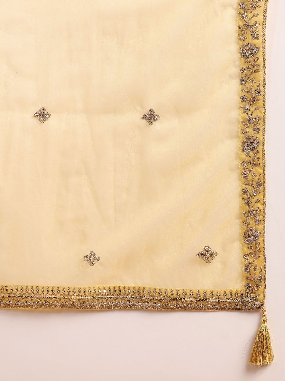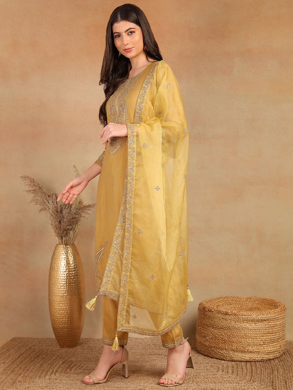 Gold Silk Blend Solid Embroidered Straight Kurti Pant With Dupatta